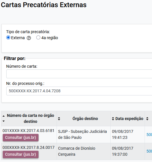 Na tela “Cartas Precatórias Externas”, para cada carta precatória com número no órgão de destino informado, é exibido um botão que permite consultá-la diretamente no Portal jus.br: